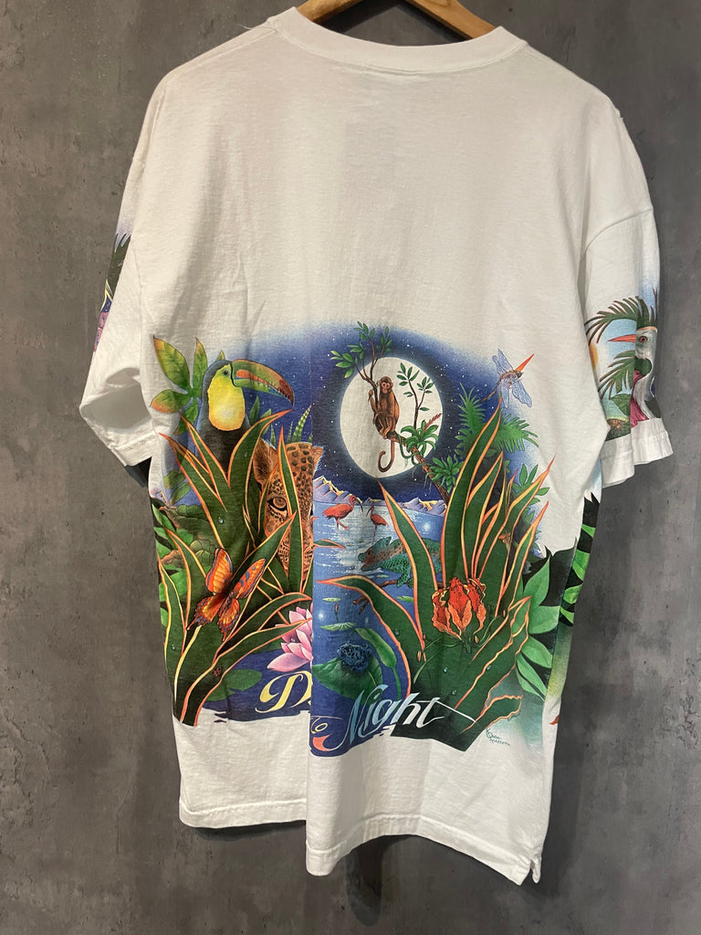 This insaneDay to Night wildlife tee is a straight-up work of art 🎨🔥. Featuring a vivid tropical paradise with a parrot, panther, sea turtles, and more—this piece transitions from day to night seamlessly! 🌅🌌