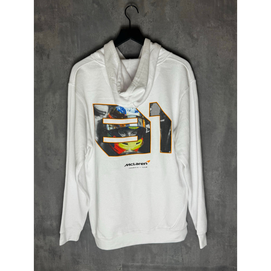 Show your support for Oscar Pastri and the McLaren Formula 1 Team with this brand new white hoodie! This medium-sized hoodie is perfect for any F1 enthusiast. It features the team's logo and Pastri's name, making it a great way to represent your favorite driver and team. The hoodie is made with high-quality materials to ensure comfort and durability. Whether you're at the track or just relaxing at home, this hoodie is a must-have for any McLaren fan. Grab it now and gear up for race day!