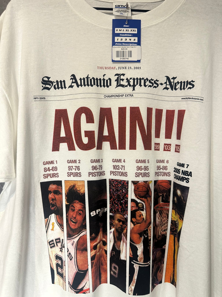 Vintage 2005 San Antonio Spurs NBA Champions Tee – "AGAIN!!!" Newspaper Print Celebrate the San Antonio Spurs’ 2005 NBA Championship with this iconic newspaper-style tee, featuring the San Antonio Express-News headline "AGAIN!!!" along with game...