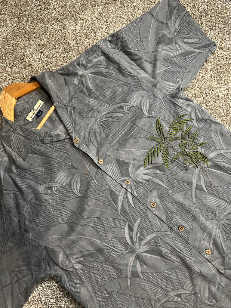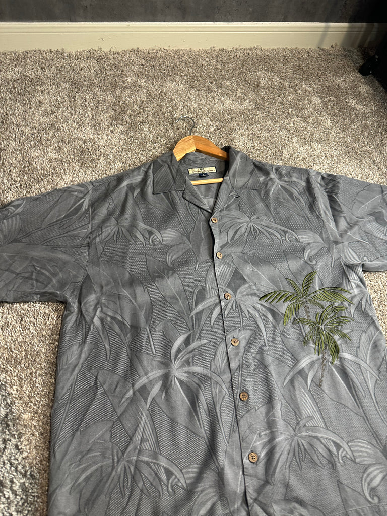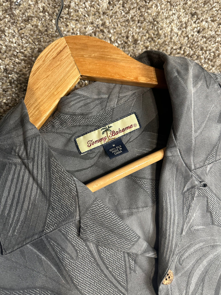 Tommy Bahama Y2K 100% Silk Palm Tree Shirt - Tonal Gray Design Medium