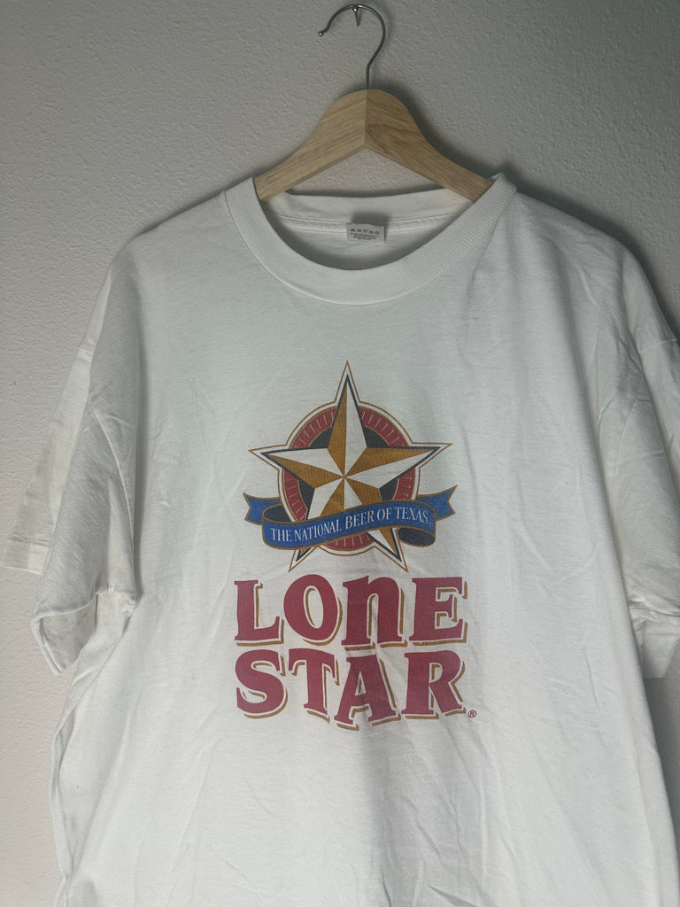 Straight Texas pride. This vintage Lone Star Beer tee reps “The National Beer of Texas” with bold red and gold branding. Printed on a Made in USA Fruit of the Loom tag—classic barwear energy.